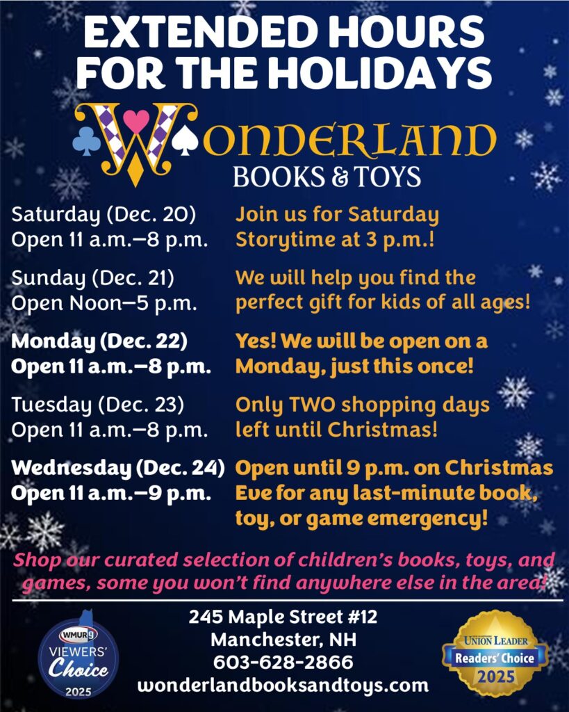 Wonderland Books & Toys is a drop-off location for the Chaos & Kindness Toy Drive 2025. They collect new, unwrapped toys for kids (infants through teenagers) as well as gift cards to provide gifts to children throughout the State of New Hampshire. If you have a gift card, please make sure it is brought to the main counter of the store so it gets into the right hands and isn’t lost in the shuffle of toys.