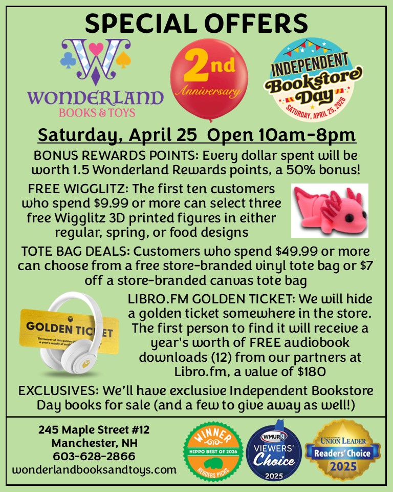 ALL DAY – Search for One Golden Ticket hidden in the store from Libro.FM good for 12 Free Audio Books ($180 value) 1st 10 Customers who spend $9.99 or more will receive 3 free Wigglitz – adorable 3D printed animals, food, and other creatures. Any purchase of $49.99 or more will receive a free vinyl tote OR take $7 off our canvas tote Current and New Rewards Members will receive 1.5 points per dollar spent – a 50% bonus!